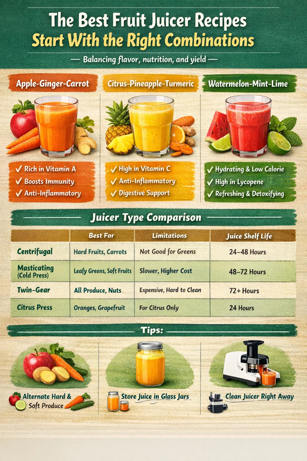 Tres mixturae constantissime summae a sucis domi aestimatae sunt: pomum gingiberis carrot, citri pineum turmericanum, et calcis PEPO mentastra. Horum unumquodque operatur, quia dulcedinis, acorem, et acre aromaticum elementum aequant. Cedunt etiam alti volumina succi in libras proventuum, quae refert cum fructum in suco omni mane pascis.