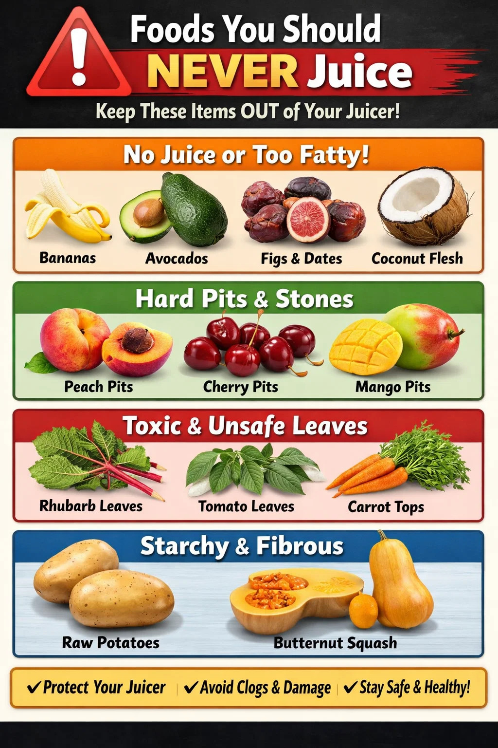 Si vis velox responsum prius tribuo in details: numquam aliquet, avocados, cortices citri integros, putei duri, cocoes caro, ficus, vel rhubarbarum folia in tua juicer . Haec item vel nullum sucum extractabile continent, nimis amylum vel pingue ad processum sunt vel plane toxici. Ultra machinam tuam deminutio vel eventus inutiles producens, aliqua ex his rebus periculum verae salutis ponunt.