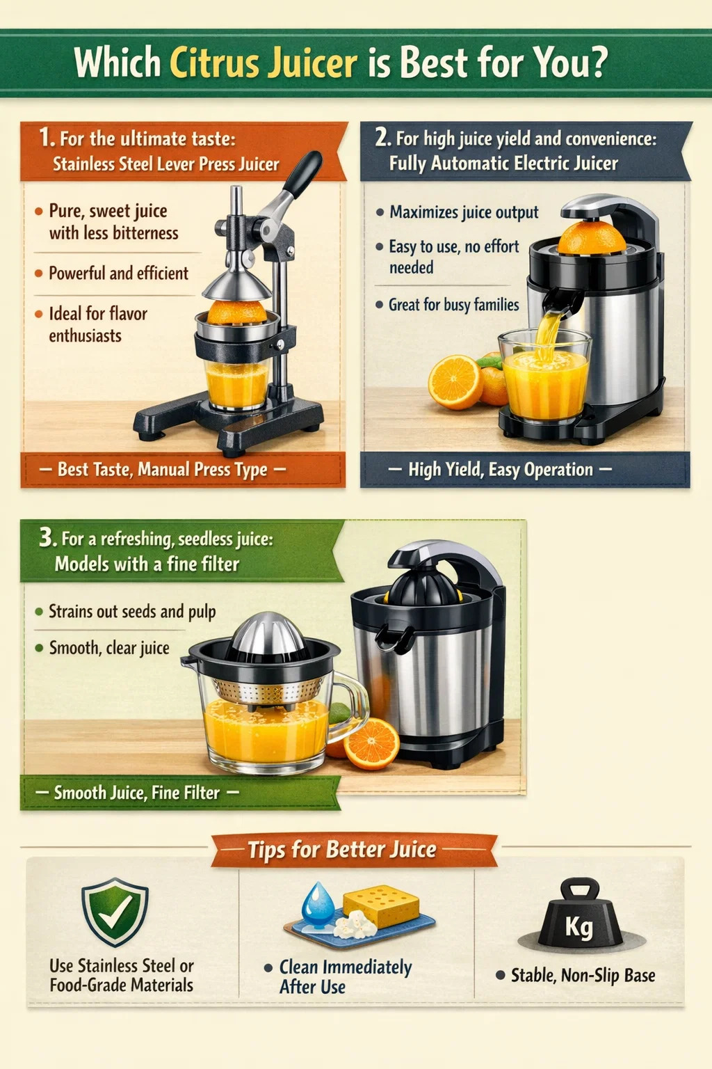 ⦁ Materia crucialis est: Conare eligere immaculatum ferrum vel esculentum materiae. Quia fructus citri valde acidici sunt, si plastica est vilis qualitas, ingratum odorem super tempus evolvere potest, viriditatem pristinam succi afficiens.