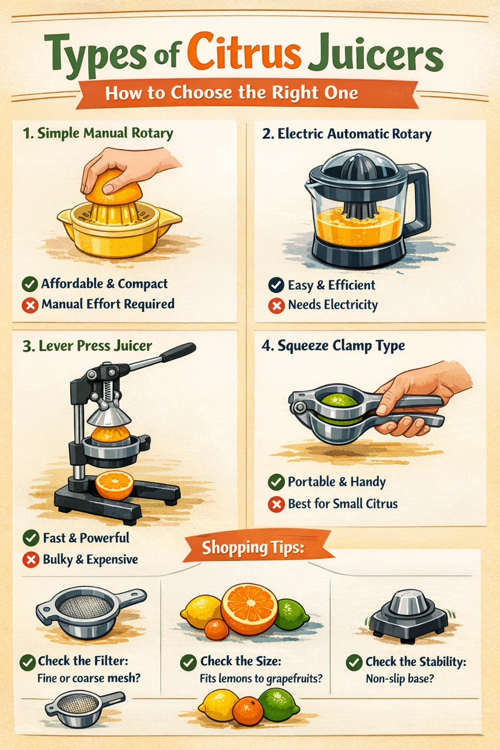 Pros et Cons: Facile uti et mundare; attamen, citrina vel tiliarum parvarum tantum apta est, nec maioribus aurantiis satis potens.
